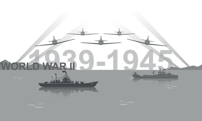 World War II 1939-1945 black and white vector illustration. Battlefield scene monochrome icon.