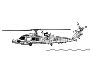 Sikorsky MH-60R Seahawk. Vector drawing of anti submarine helicopter. Side view. Image for illustration and infographics.