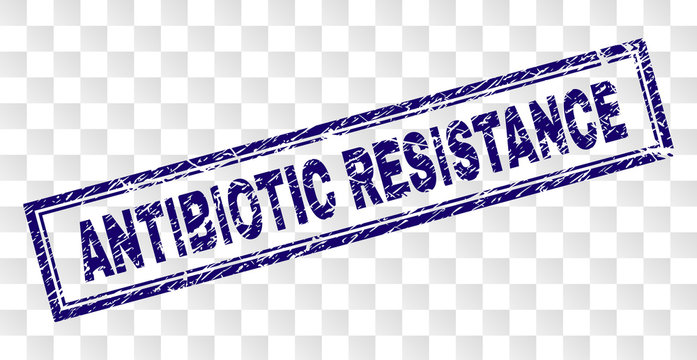 ANTIBIOTIC RESISTANCE stamp seal print with rubber print style and double framed rectangle shape. Stamp is placed on a transparent background.