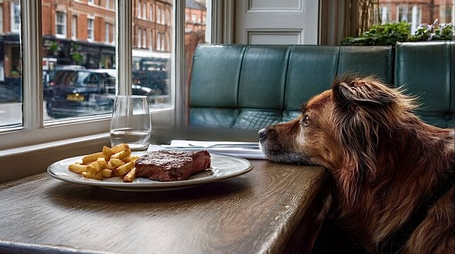 Hungry dog anticipating steak and fries in a pet friendly restaurant