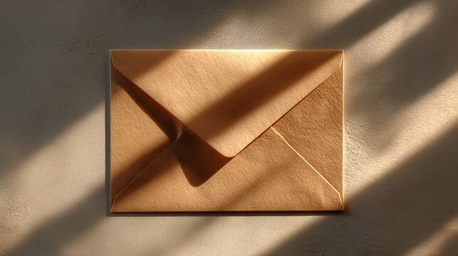 Golden hour light highlighting a kraft paper envelope on textured surface for announcements or invitations, evoking anticipation and thoughtfulness