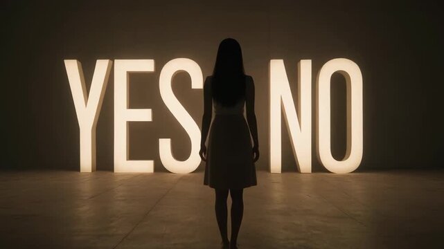 A woman stands before illuminated words, contemplating a decision between yes and no.