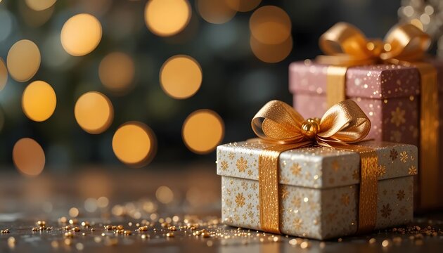 Exquisitely Wrapped Gifts Gleam With Golden Ribbons, Promising Joy And Festive Cheer Against A Backdrop Of Warm, Shimmering Lights