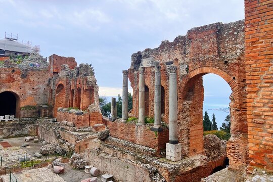 Teatro Antico di Taormina (Ancient Amphitheatre) in Sicily, Italy during sunny day with sea in the background