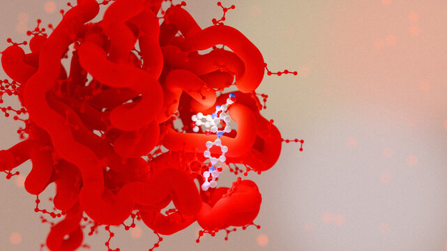 Heparin (UFH) anticoagulant molecules in the blood flow - section view 3d illustration
