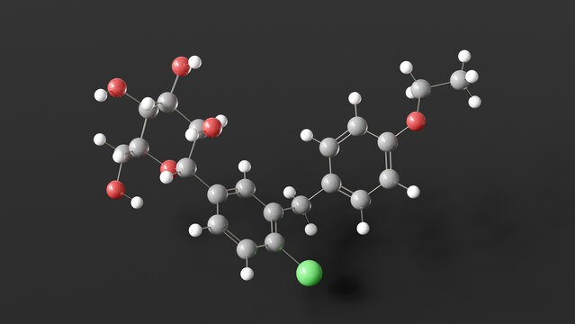 dapagliflozin molecule 3d, molecular structure, ball and stick model, structural chemical formula antidiabetic drug