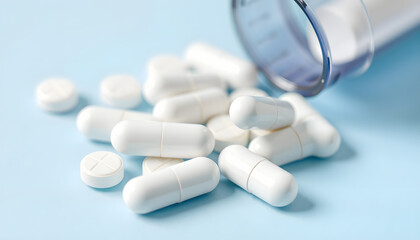 White pills close-up on a blue-white background. close-up, pharmacovigilance, safety quality control isolated with white highlights, png