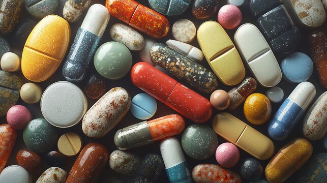 Vibrant close-up of assorted pharmaceutical pills, showcasing various shapes, colors, and sizes, representing modern medicine and healthcare solutions
