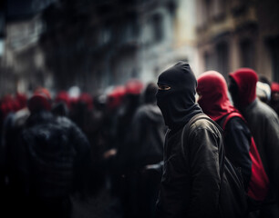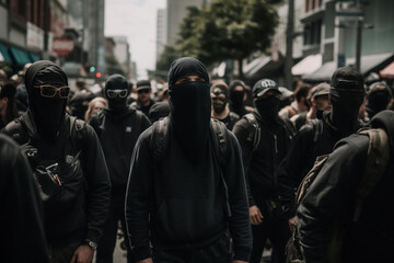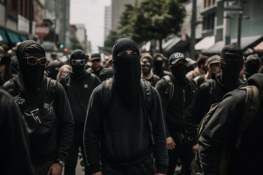 A protester in black bloc attire, standing in front of a shattered storefront, symbolizing the radical and sometimes violent actions associated with Antifa