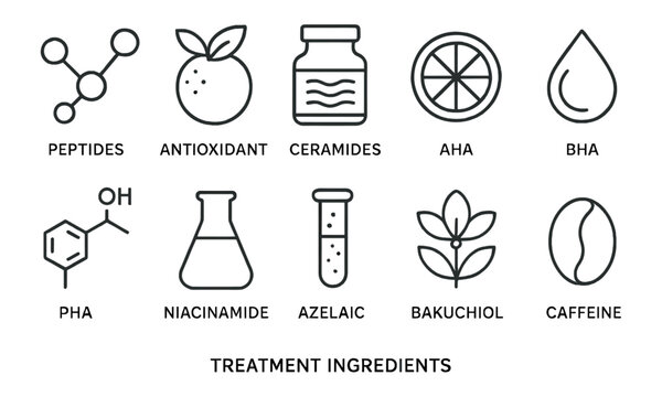 Organic cosmetic line icons set. Organic skin care components or labels. Sensitive Skin, Vitamin C, Omega-3 Fatty Acids, Hyaluronic Acid, Vitamin E, Aloe Vera, Retinol, Collagen, Peptides,