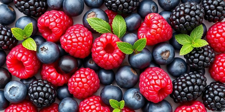 A vibrant mix of raspberries, blueberries, and blackberries, isolated on white, showcasing their juicy texture and rich color,  delicious,  antioxidants