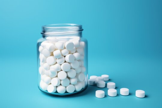 White pills in a glass jar on blue background. Focus on foreground. The concept of pharmacology, maintaining health with pills and supplements