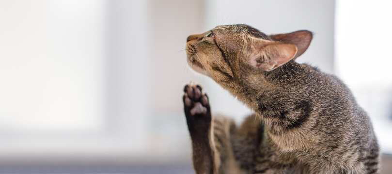 Tabby cat itching itself, possible flea or mite infestation, concept for veterinary treatment and antiparasitic shampoo