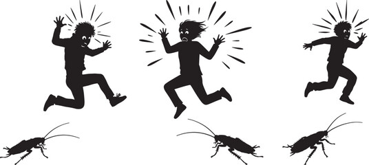 People jumping in shock and fear from cockroaches in a striking silhouette style