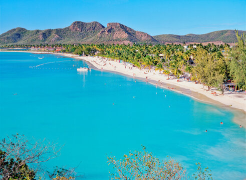 Antigua. North from Coco Beach over Valley Church Bay and Lignum Vitae Bay to Jolly Harbour on west coast of Caribbean island