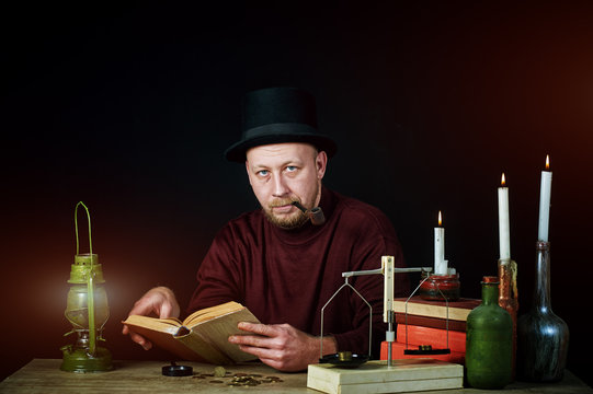 Stylized portrait of a man in a top hat with a pipe , old books and candles