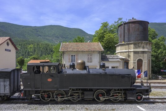 Historic train with steam locomotive at Annot station, Alpes-de-Haute-Provence, France