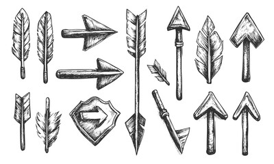 Vintage monochrome arrows with feathers isolated on white background. Hand drawn design element template for emblem, print, cover, poster. Vector illustration.