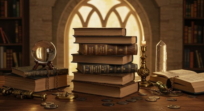 Mystical Library: Ancient Lore and Arcane Secrets - A mesmerizing stack of antique books, a crystal ball, and mystical artifacts evoke a sense of ancient knowledge, hidden wisdom, forgotten magic
