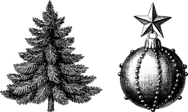 Vintage christmas design with engraved fir tree and bauble for holiday decor