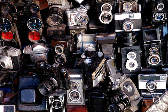 Old vintage rare retro photographic equipment, photo cameras sold at the flea market, swap meet