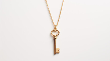 Gold Key Necklace With Heart Pendant - Dainty Jewelry for a Meaningful Gift. White background. Valentine's Day mood. Copy space.
