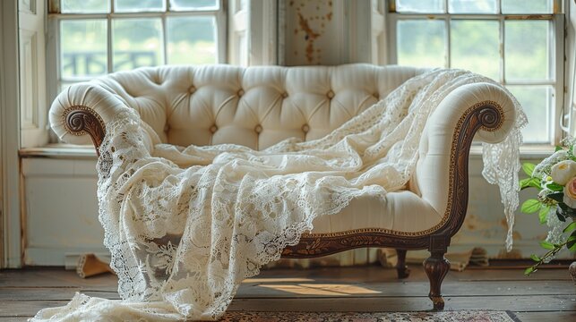 Model with hair adorned in vintage accessories, emphasizing age-old beauty, set in an antique living room