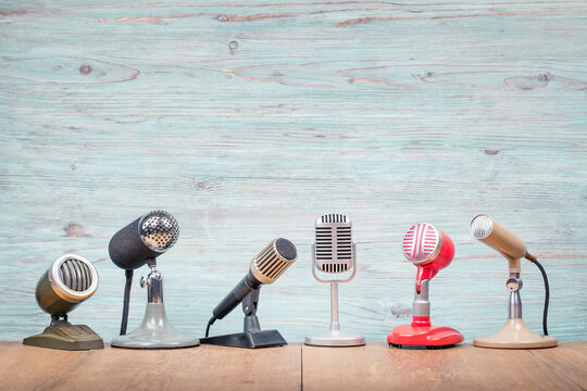 Retro old microphones for press conference or interview on table front textured light blue wooden wall background. Vintage old style filtered photo