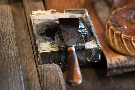 Old, metal letters, printing machines. Vintage, antique metal machinery working in slow motion, classic, traditional workshop. Man creating a book.
