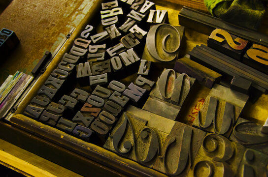 A textured background of old, used, wooden type-setting letter blocks with various fonts, upper- and lowercase, antique letters, all shapes and sizes.