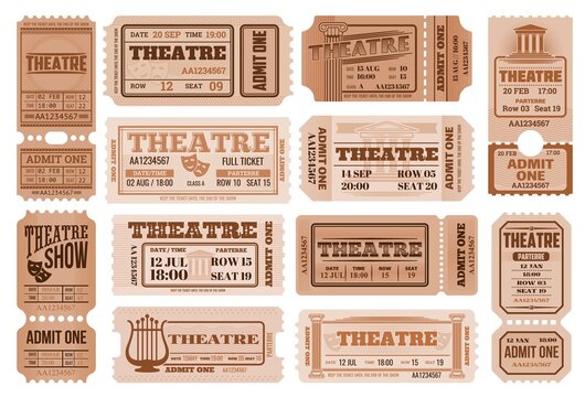 Theatre retro tickets, theater admits templates. Vector coupons performance access with date, time, seat and row number, price and separation line. Vintage paper cards set for entertainment entry