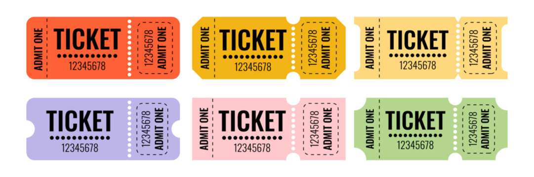 Set of colorful ticket templates featuring bold fonts and clean lines for event invitations or promotions