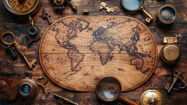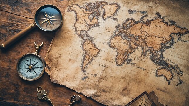 A detailed close-up of a vintage world map laid out on an old wooden table. Surrounding elements include a compass, magnifying glass, and antique keys. Warm sepia tones create a nostalgic atmosphere.