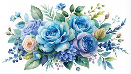 Delicate, dreamy watercolor illustration of a lush bouquet featuring majestic blue roses and complementary blooms, gently arranged on a pristine white background.