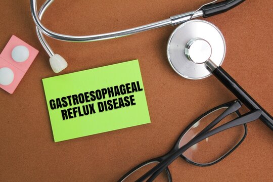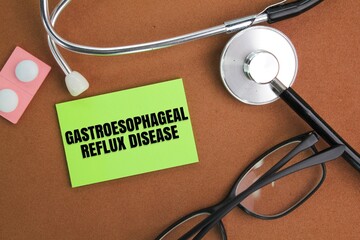 stethoscope, glasses and colored paper with the words Gastroesophageal reflux disease. concept of disease and medicine