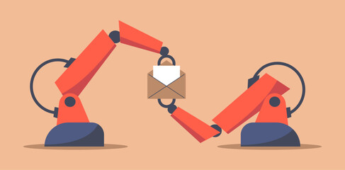AI Mailbox message management automation and antispam filter with AI service. Robotic arm holding envelope with email letter to receive and send digital correspondence. Flat vector illustration.