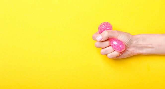 Rubber toy antistress in a woman's hand on a white background.