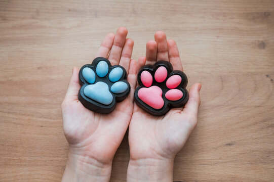 Taba paws blue and pink colorful toys antistress squish isolated on wood background.