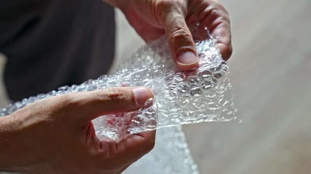 Close up video of hands popping air bubbles on plastic bubble wrap. Concept of relaxation, stress relief, and sensory satisfaction