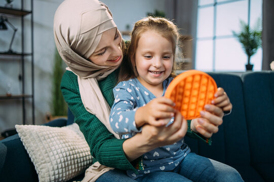Educational children's games, poppit, antistress sensory pop it toy. Excited joyful adorable little girl, playing a popular anti-stress game with buttons, sitting on sofa with her Arab mom in hijab