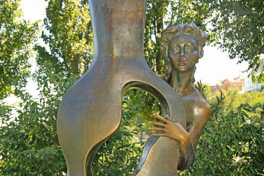 TAGANROG, RUSSIA - AUGUST 27, 2011: Sculpture "Romance with contrabass" , based on the story by Anton Chekhov with the same name
