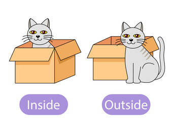 the cat sits inside the box and next to the box. the concept of children learning opposite prepositions inside and out.