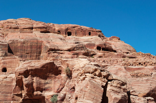 Sito archeologico di Petra, 02/10/2013: le costruzioni e le diverse colori, forme e sfumature delle rocce rosse nel canyon della valle giordana