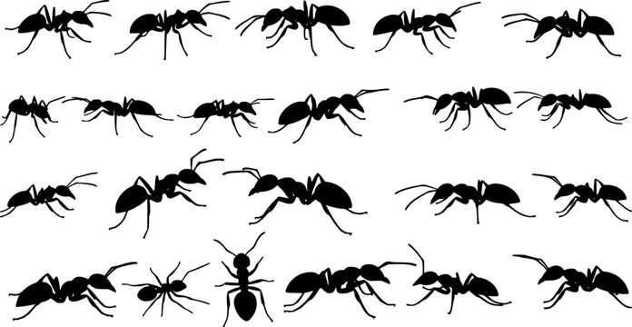 Set of ants black silhouettes isolated on transparent or white background, vector illustration.