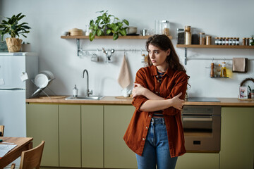 Upset young woman sitting indoors on a grey sofa, hiding her face with her hand, conveying distress or sadness.