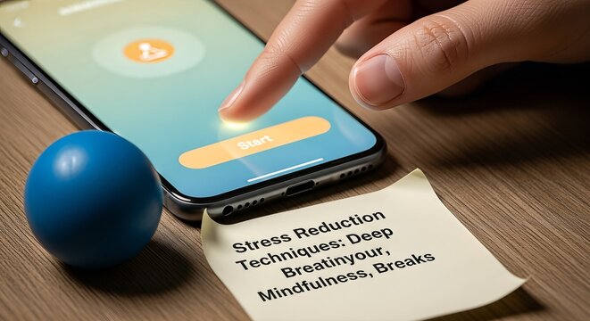 Hand holding smartphone with stress reduction techniques on screen.