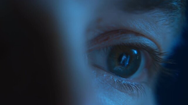 Macro shot of a tired human eye looking at glowing smartphone screen and reflects social media feed, illuminated with blue light at night. Eyestrain, digital addiction or insomnia concept