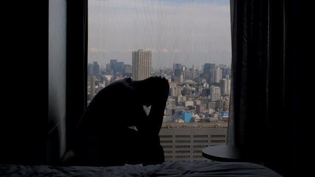 silhouette of adult man anxiously sitting near high rise window, shaking his head in his hands with panoramic view of the city metropolis in background. Static shot