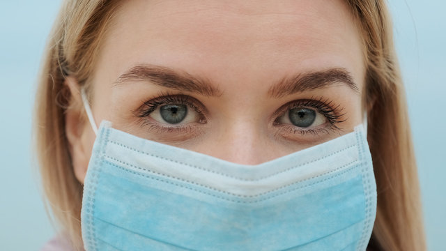 Close-up portrait woman blonde medical mask her face fluttering in wind during quarantine Coronavirus COVID-19 virus looks distance anxiously frowning forehead. Epidemic, pneumonia, hygiene. Pandemic