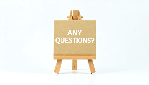 Wooden Easel Displaying "Any Questions?" on a Neutral Background.